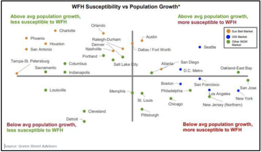 Green Street Advisors (2Q21 publication) produced a graphic charting WFH “susceptibility” against population growth across the top 35 U.S. metros. The chart also color codes the markets into three buckets; Sun Belt Markets (Charlotte, Phoenix, Salt Lake, Houston, etc..), Gateway Markets (Boston, New York, LA, etc..), and other Non-Gateway Markets (like Indianapolis, Memphis, or Cleveland, no offense). We show the graphic from Green Street on the next page. It provides an excellent illustration of what we are seeing across our portfolio regarding a continued increase of office use.