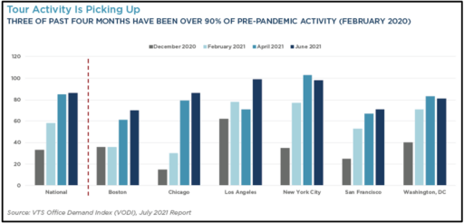 Another drumbeat data point is the continued uptick of office leasing activity across the US. According to Cushman & Wakefield’s 2Q21 report, the national office vacancy rate is currently 17.2%, although according to Transwestern’s U.S. 2Q21 report, overall office saw positive net absorption of 22.9M RSF, and asking rates are up 1.9% over trailing 12 months. Leasing activity is up across the country as of the first half of 2021, and new leasing activity jumped quarter over quarter by 18% and 7%, respectively, per Cushman & Wakefield 2Q21 report. Will this increased activity be sustainable and correlate to new incremental tenant demand? Only time will tell.