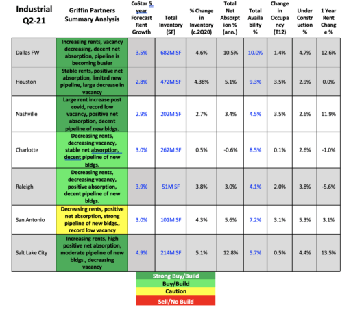 Houston and Charlotte have some of the lowest amounts of space under construction when evaluated as a percentage of the total industrial inventory. This has resulted in Charlotte posting a very impressive 5.2% rent growth over the last twelve (12) months. Houston, arguably the hardest-hit major US industrial market during the pandemic, has roared back with almost eighteen (18) million square feet of absorption over the last twelve (12) months (per CoStar 2Q21). Houston’s rent growth has really lagged the other larger markets during this period (a paltry 1.8%) but has the most room for improvement as leasing activity will continue to pick up over the back half of 2021.