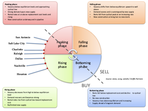 These markets are frequently at different stages in the CRE cycle relative to each other at any given time. We’ve borrowed the Jones Lang LaSalle (JLL) illustration of these differences in a graphic called the “property clock,” which we have mentioned in previous quarterly reports. For those that don’t remember or need a quick refresher on what the property clocks are, they provide a relatively easy way to understand visually where a particular market sits within the real estate cycle. Many firms use this standard four-phase cycle analysis, with some minor variations between firms. The four phases are rising, peaking, falling, and bottoming.