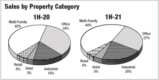 Looking at the sales volumes of the various CRE sector types in 1H21, multi-family and industrial led the charge. Multi-family sales were the leader in the clubhouse, with $60 billion in sales in the first half of 2021, and Industrial sales overall percent increase year-over-year was literally off the chart with a 122% gain in trade volume and a total of $28 billion (up from $12 billion from 1H 2020). Office sales were in second place in terms of gross dollar volume, but a distant third in year-over-year growth, as investors are slow to rush back into office given the uncertainty of future office demand arising from the work-from-home (WFH) trend. We see this uncertainty as opportunity and will touch upon it later in this report.