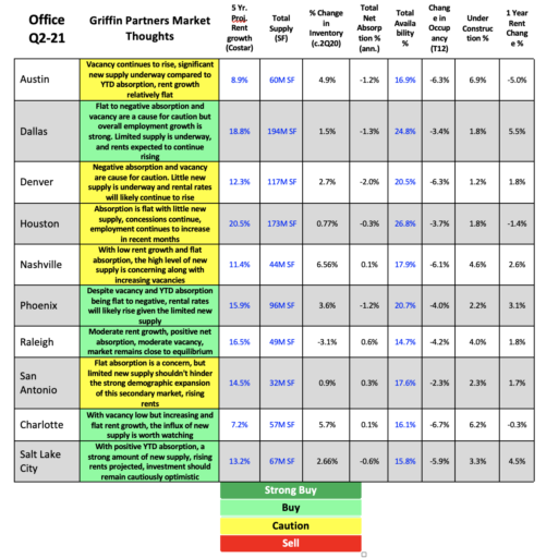 A summary of our analysis, compiled for Office, is set forth in the table on the following page along with a brief comment on our assessment of the current fundamentals as well as a color-coding for a “Strong Buy”, “Buy”, “Caution”, “Sell”.