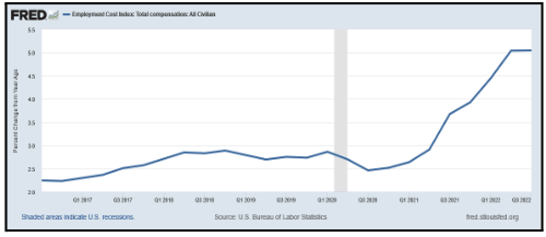 quarters are down sequentially over their respective prior quarters. The monthly read of the year-over-year rate of change is also showing signs of stabilizing, albeit at an elevated rate. The Fed likely considers this metric to be an indication of how embedded inflation and inflation expectations are in the overall economy. We aren’t big believers in the dreaded “wage-price spiral”, but there is no doubt that elevated employment costs will have some feedback into the overall price level.