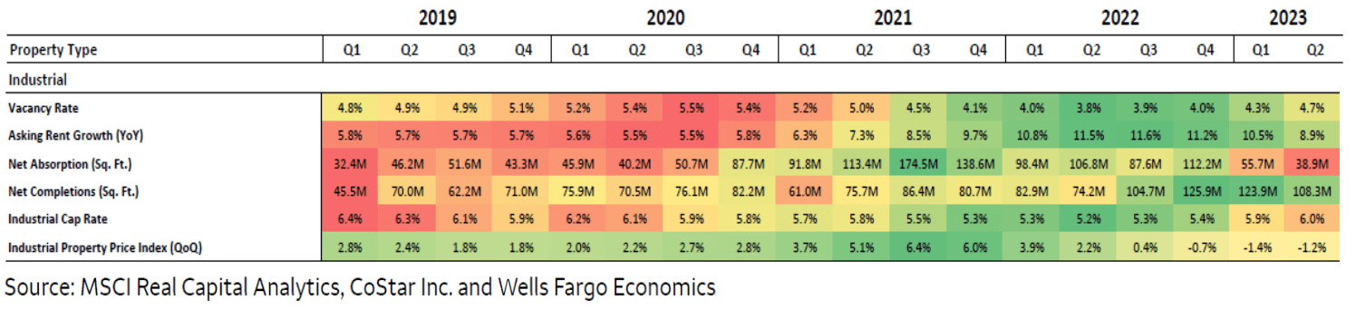 - Fundamentals across the Industrial sector have continued a positive run over the last 11 plus quarters as summarized in the table below. The entire right-hand side of the table is relatively green (meaning good!), although we are starting to see cracks in some fundamentals as the amount of new deliveries exceeds absorption. As depicted on the left-hand side, pre-Covid, fundamentals had slowed with only 45.5 million square feet of new deliveries in 1Q2019. Since 2021 developers have been busy building massive amounts of product, an average of 115.4 million square feet per quarter since 1Q2021. That rate of new supply was double the average from 2019 through 2020. The new supply was responding to record amounts of demand as absorption exceeded supply for seven consecutive quarters, often significantly, ending in Q32023. As a result, the Industrial CRE sector has been resilient and so far, avoided any potential overhang of supply. Based on our internal data, we believe that new supply will begin showing significant decline this quarter, continuing throughout 2024. With continued growth of onshoring, manufacturing and e-commerce, the long-term outlook for industrial demand remains positive.