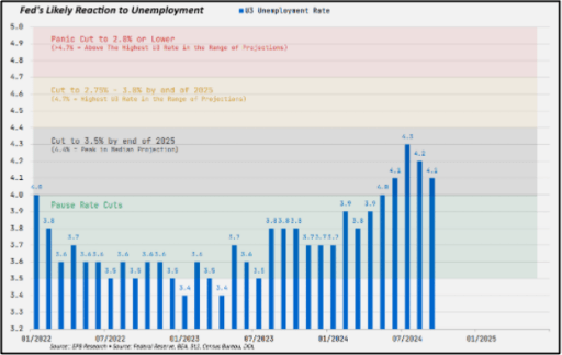 EPB Marco Research believes the unemployment rate is likely to “continue increasing in the months and quarters ahead because of the momentum that is passing through the Business Cycle Sequence from Leading [remember LEI from above] to Cyclical data.” The Cyclical Economy includes residential construction and manufacturing, which are both contracting at present. EPB forecasts that a resumption of the increasing unemployment rate trend will cause a repricing of the terminal rate expectations back into the upper 2% range (meaning the end point of the lowering cycle for overnight rates). The chart nearby shows EPB’s projected likely interest rate outcomes for given ranges of unemployment. Our forecast currently has one-month term SOFR (usually on top of the Fed Funds rate) between 3.25% and 3.5% at the end of 2025. The current Fed dot plot for the end of 2025 is 3.5%, and the market forward curve is 3.85%, down slightly from approximately 4.0% on election day.