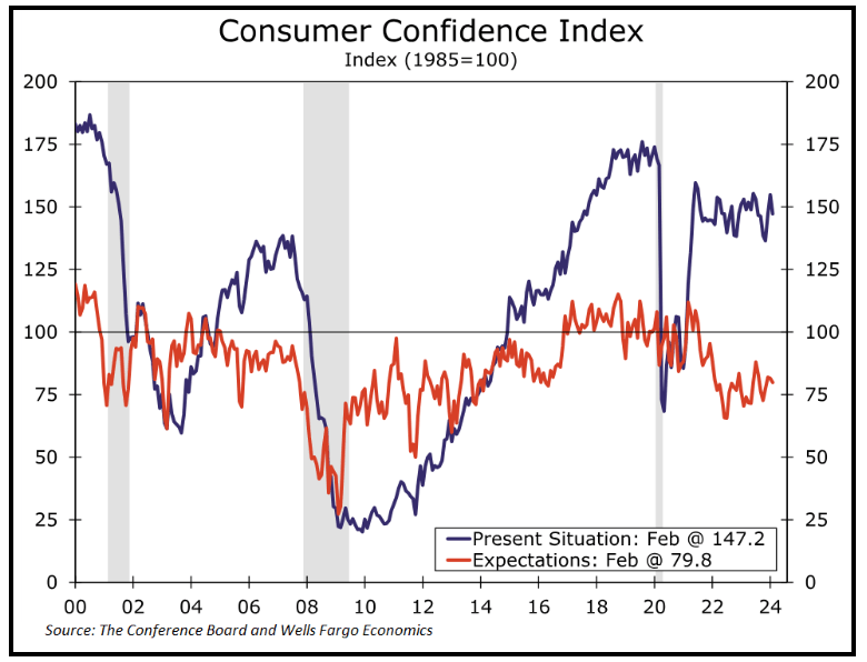 GDP growth, while down slightly in Q4-2023 compared to Q3, is still above long-term trend for both Q4 and the full year 2023. Moody’s reports that “real GDP declined from a clearly unsustainable 4.9% in the third quarter to a still unlikely to be sustained 3.2% in the fourth quarter….” 2023 GDP growth was higher than 2022, and U.S. growth is outperforming the other G7 countries.
